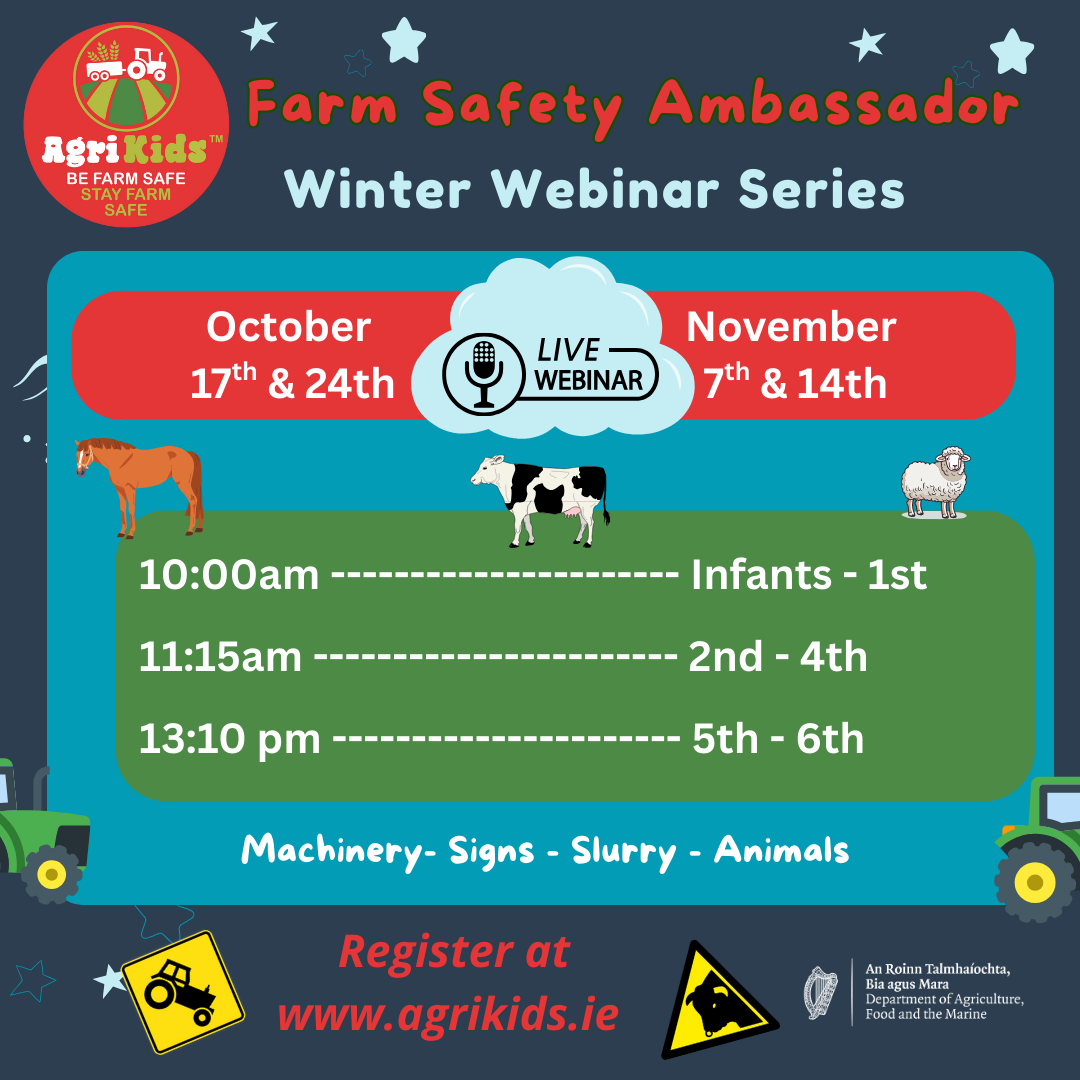 Presented by AgriKids, each webinar will focus on safety signs; slurry safety; animal behaviours and machinery through age appropriate images and graphics. There is also an event for teachers and all educators taking place on October 8th at 3.30pm.